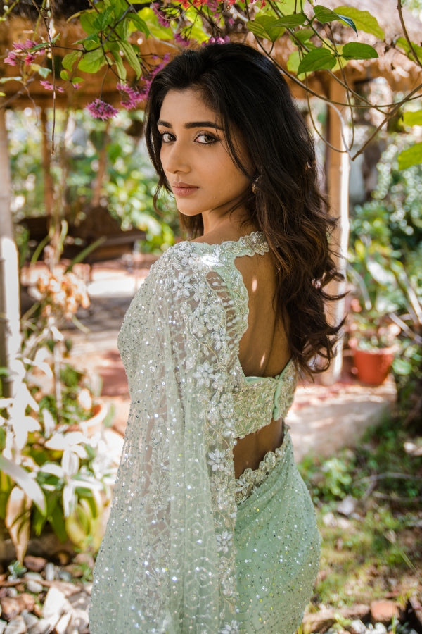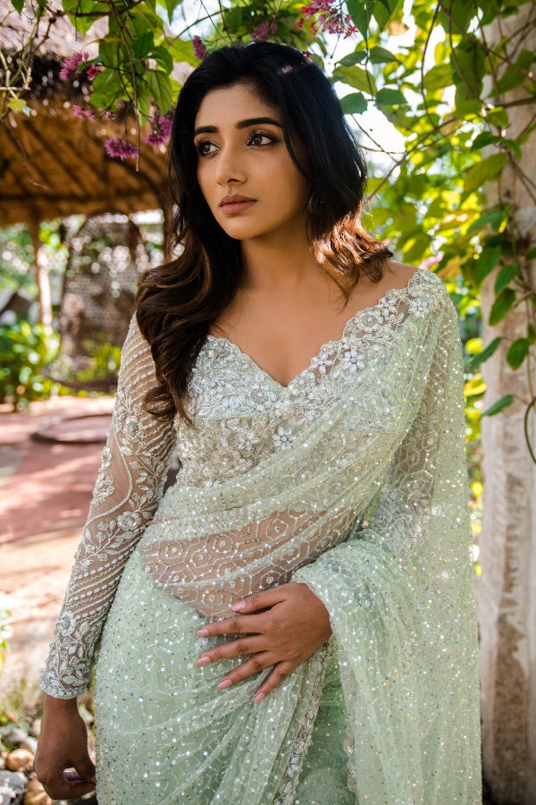 A strikingly elegant designer wedding wear in mint green paired with a tulle designer blouse, a perfect bridal saree set.