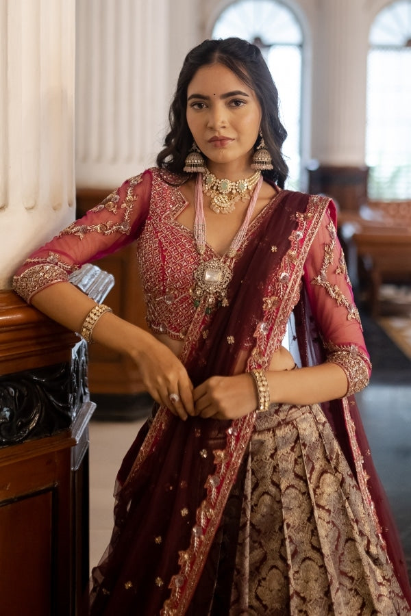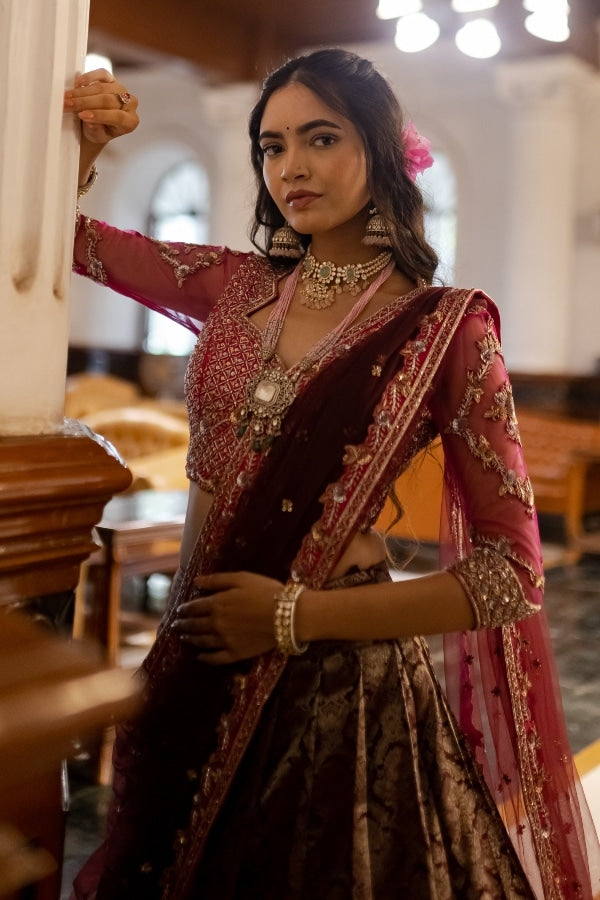Regal and traditional pure pattu half saree fit for an Indian princess this pink and brown ensemble in pure kanjeevaram silk comes with a designer blouse.