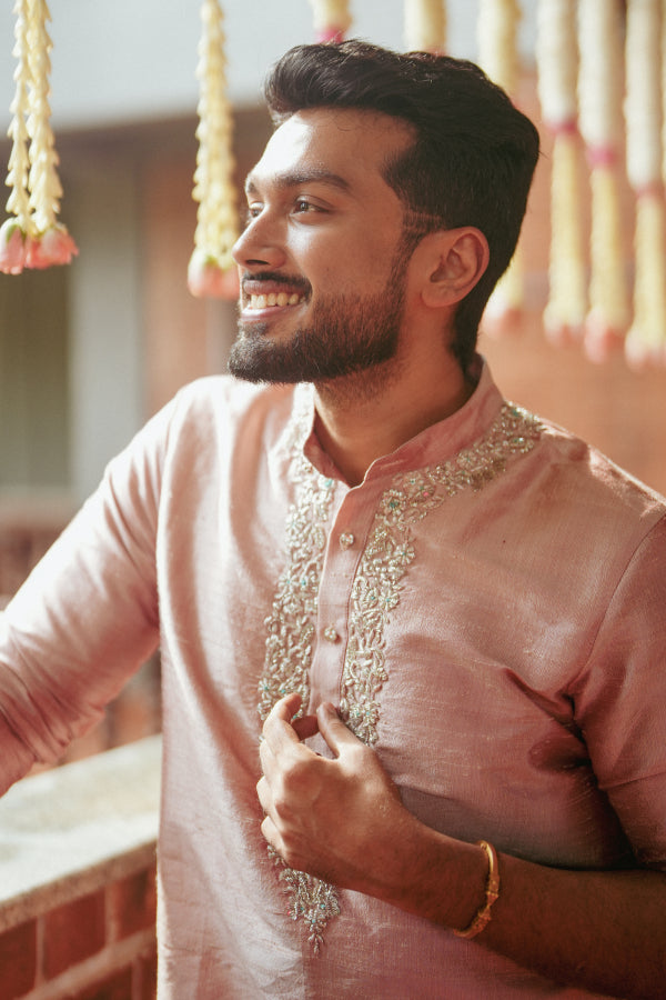 This traditional silhouette is envisioned in a Rose gold silk kurta worn over a silk veshti in a monochromatic tone for our Regal groom, exuding a sense of traditional charm and cultural richness, combining ease with aesthetic.
