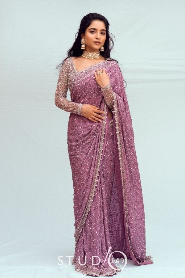 Enhancing an all Lilac designer saree paired with our signature tulle blouse with zardozi work, a perfect Wedding reception saree.