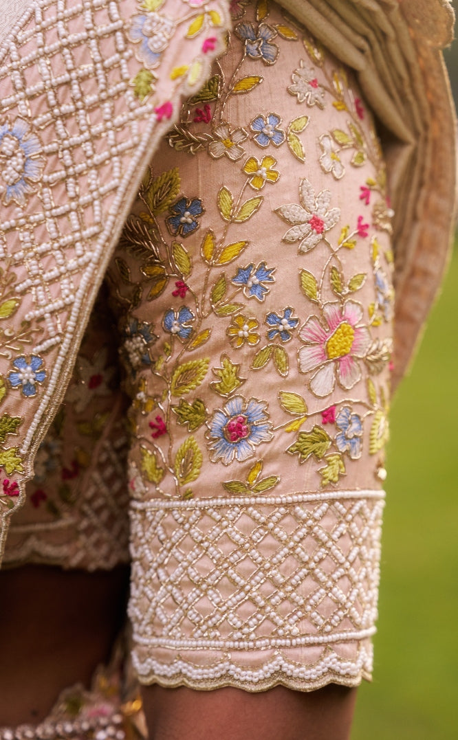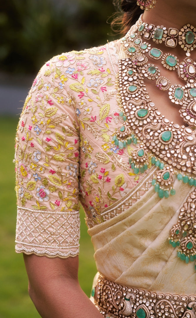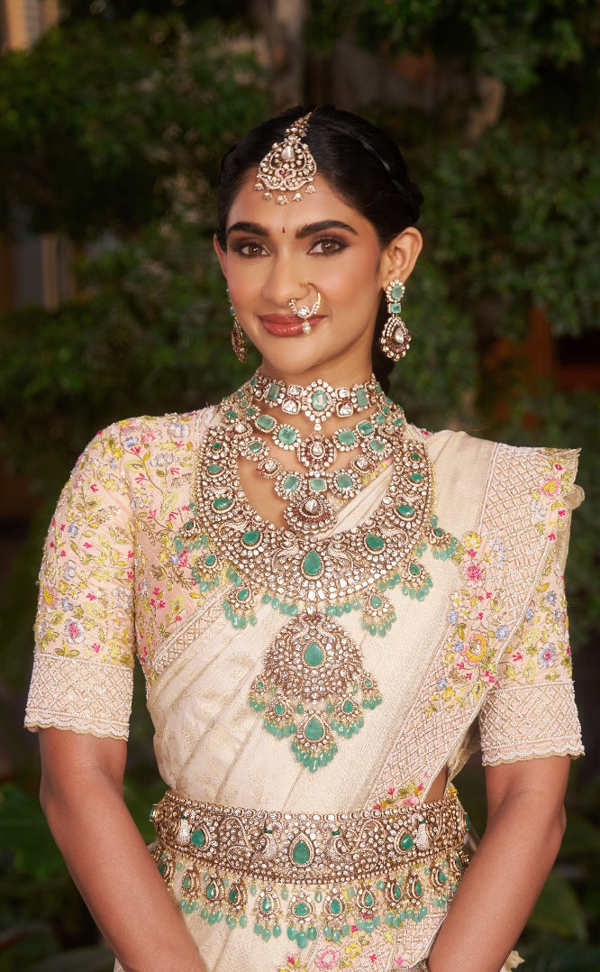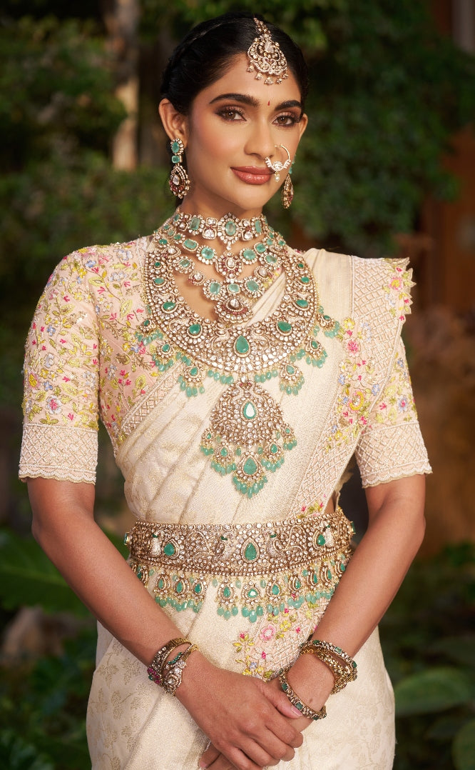 Handwoven Kanjeevaram in its purest form, this pristine white saree is a quiet celebration of heritage and refined craftsmanship. Adorned with delicate pastel floral borders and Studio149’s signature interplay of florals and grid motifs, the weave balances tradition with a contemporary sensibility. Subtle hints of colour gently emerge against the ivory base, adding depth while preserving its serene, understated beauty. Designed for the modern bride who finds strength in softness, this saree is especially suited for a Telugu muhurtham—where elegance speaks louder than excess. The fluid drape, combined with the richness of pure silk, creates a silhouette that feels both regal and effortless. A piece close to our heart, it embodies a timeless aesthetic that transcends trends. Graceful, minimal, and deeply rooted in culture, this saree is an ode to understated opulence—crafted for moments that are intimate, meaningful, and everlasting.